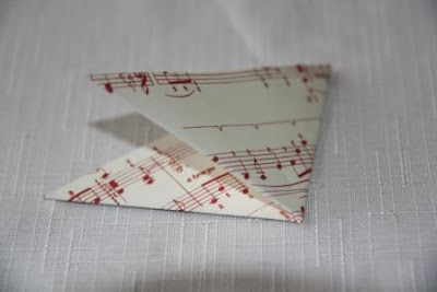 Step 9- Glue the 2 middle rolls together- in this case making sure that the pattern is going in the same direction, so one music roll adhering to one striped roll. Step 10- Glue the bottom 2 points together. Repeat to create 4 sets of 2.